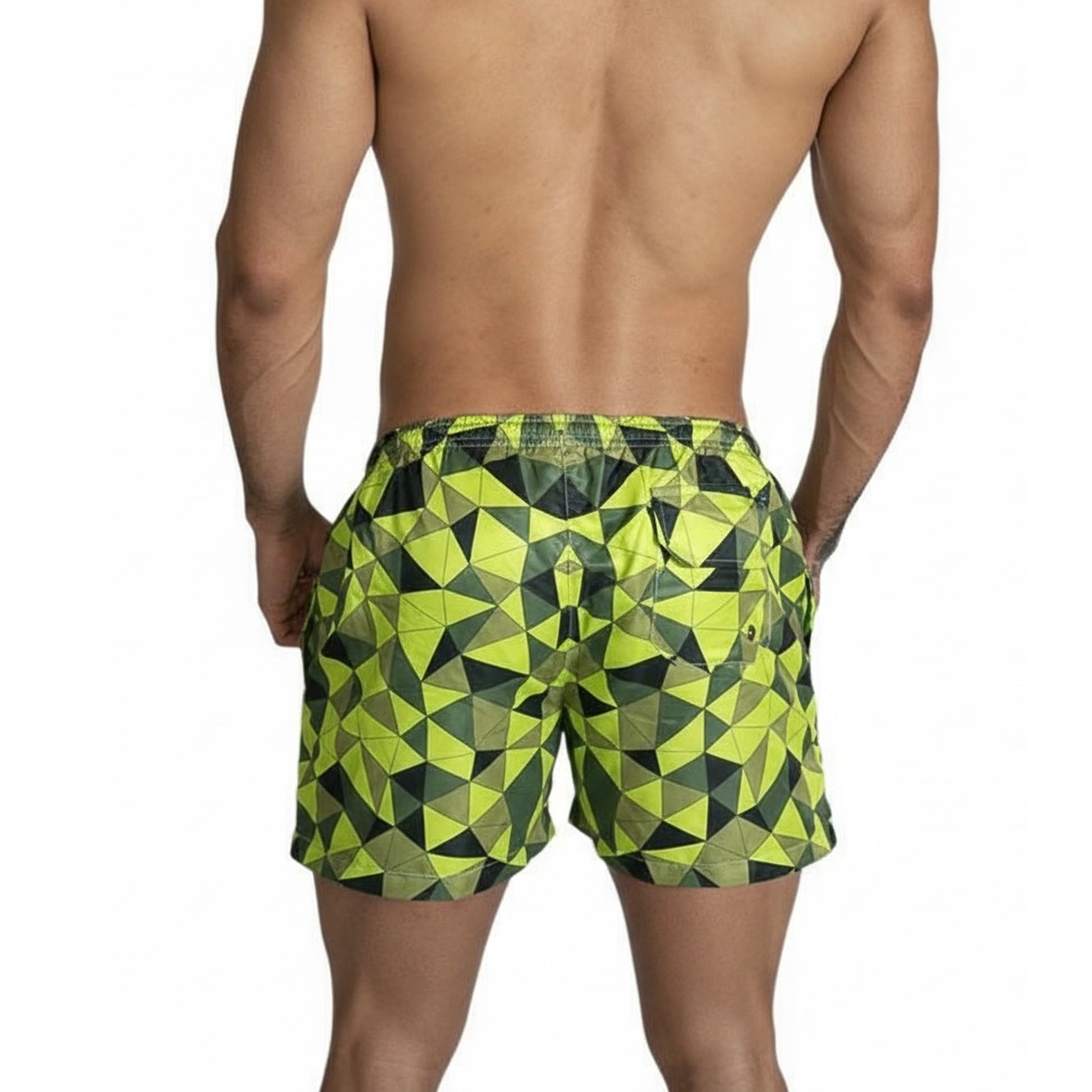 Equal swimwear Short swimsuit from the Prisma collection, a design that transforms classic shapes into contemporary designs, polygon figures in different tones, designed for men who seek originality without losing elegance, ideal for any type of pool or beach.