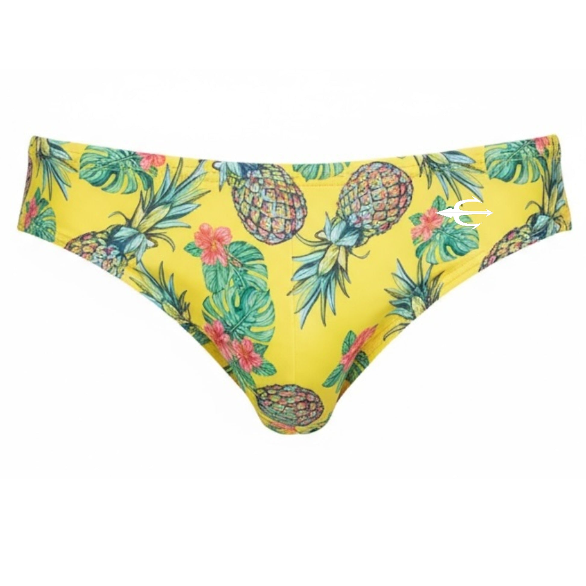 La combinación del color amarillo intenso con los tonos verdes y rosados de las piñas crea un contraste fresco y llamativo que atrae todas las miradas, perfecto para quienes disfrutan ser el centro de atención en la playa o la piscina.